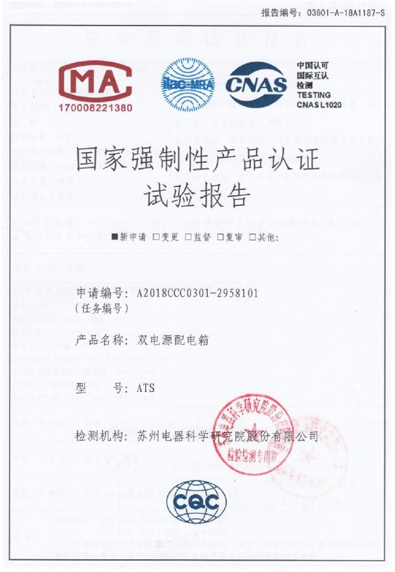 双电源配电箱强制性产品认证实验报告