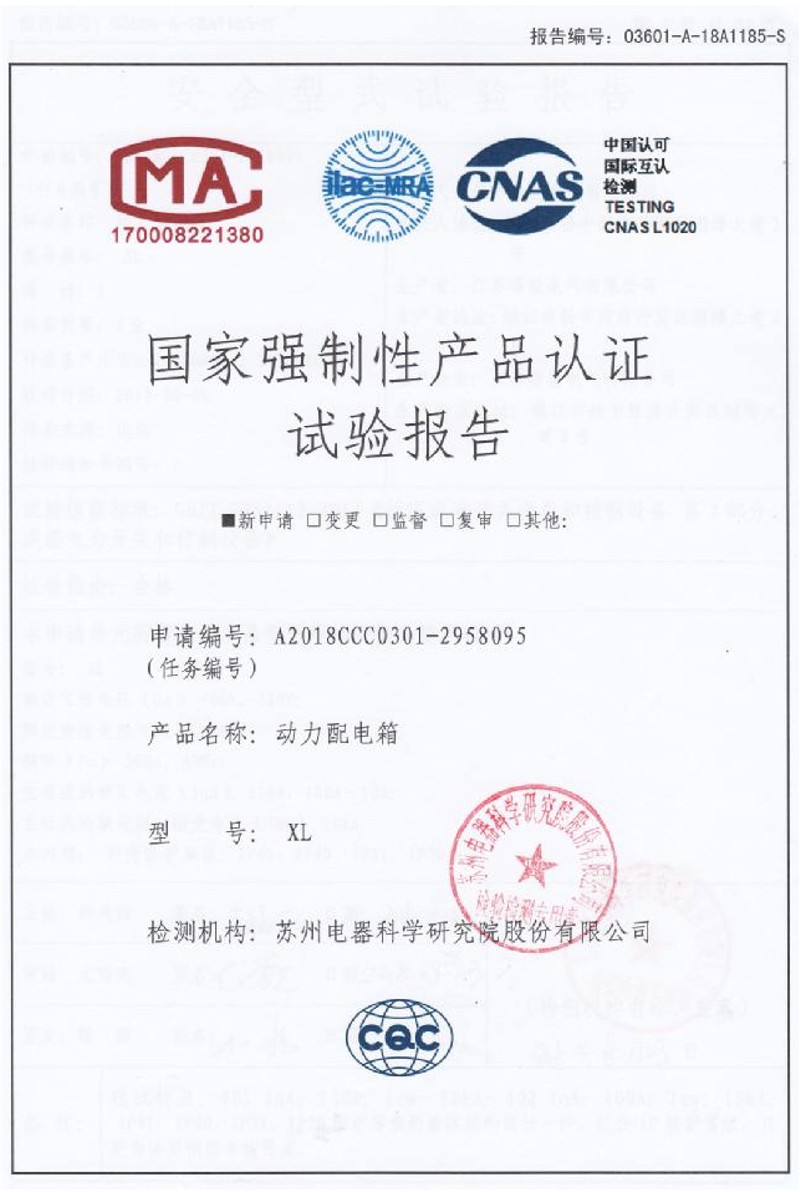 动力配电箱强制性产品认证实验报告